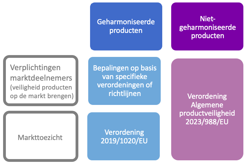 Voor producten waarvoor geen harmonisatiewetgeving is, bv. ladders, niet-aangedreven handgereedschap, meubilair, gelden de algemene regels zoals vastgelegd in de verordening algemene productveiligheid (2023/988/EU) waarin ook de regels voor het markttoezicht op deze producten zijn bepaald.