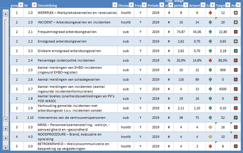 Arbeidsongevallen en incidenten: bestaat uit tien sub-KPI’s en focust op alle gegevens rond incidenten; arbeidsongevallen, EHBO-incidenten, bijna-ongevallen, schadegevallen, …